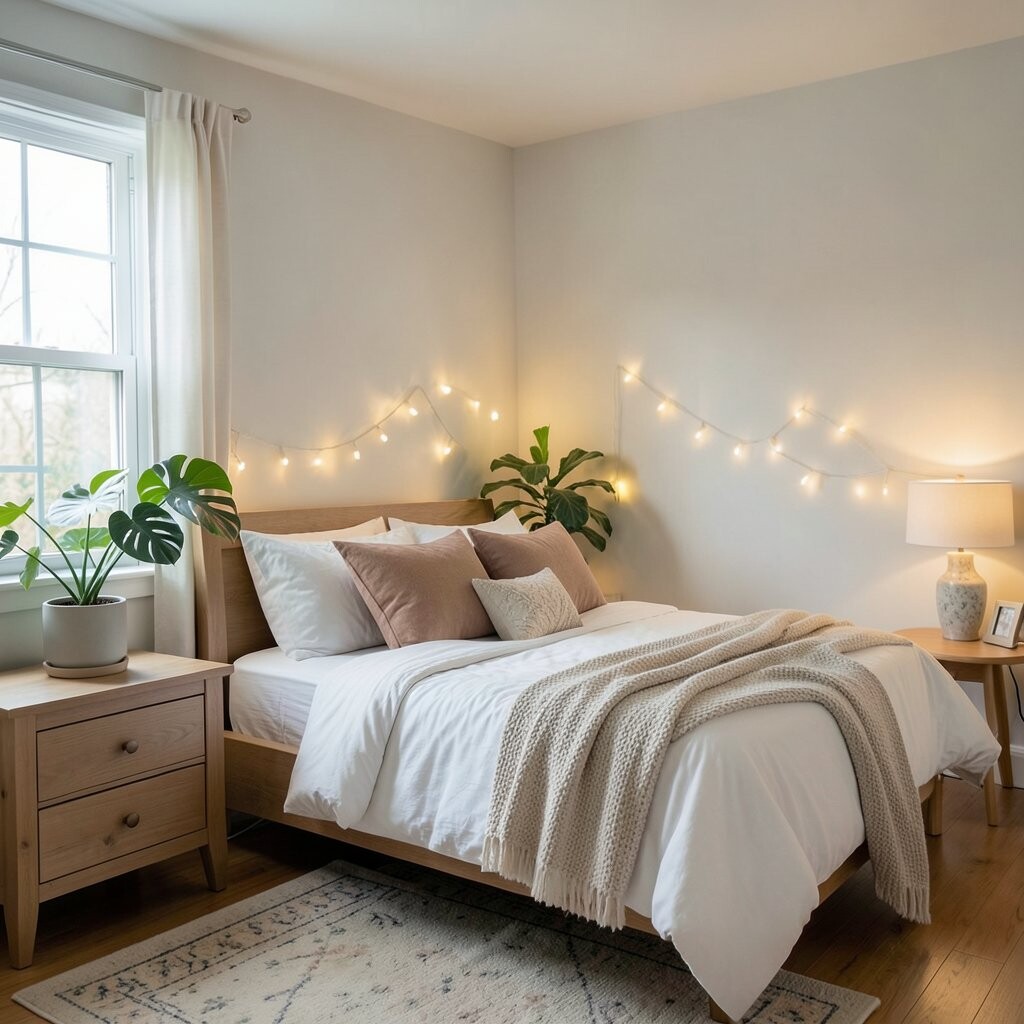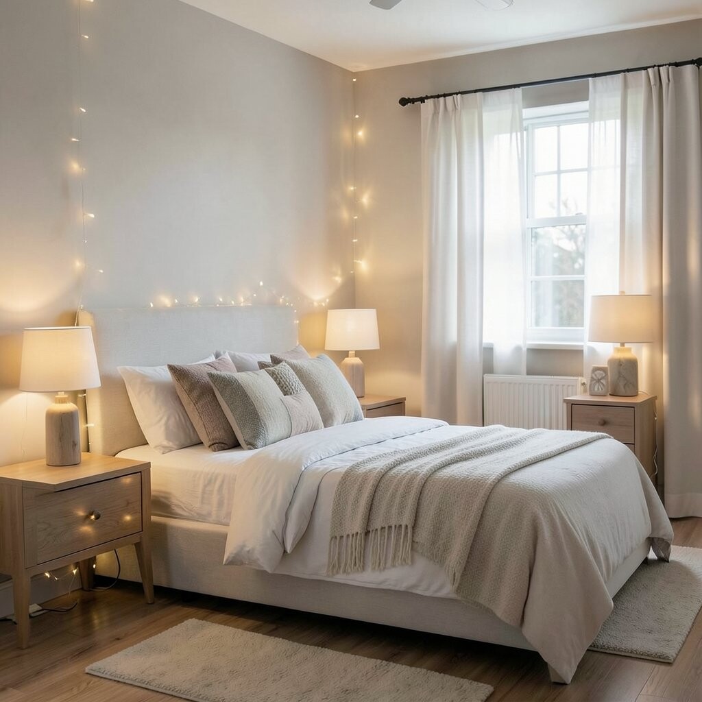 Place twinkle lights in jars or lanterns beside your bed for a touch of bliss. They provide a soft, soothing light ideal for winding down.