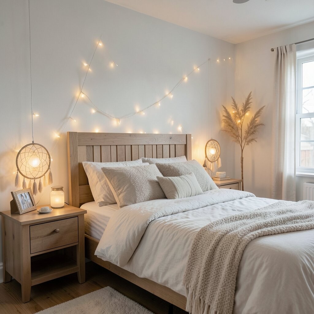 Wrap a dreamcatcher in twinkle lights for a boho-chic decor piece. It adds a mystical, calming vibe to your bedroom.