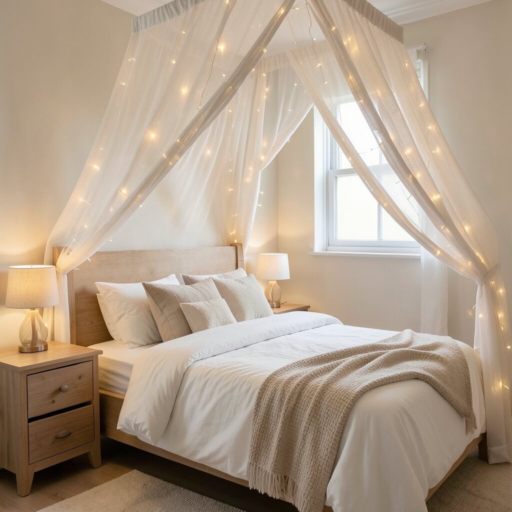 Draping twinkle lights over a bed canopy creates a magical sleeping nook. It’s like sleeping under a sky full of stars, right in your bedroom.