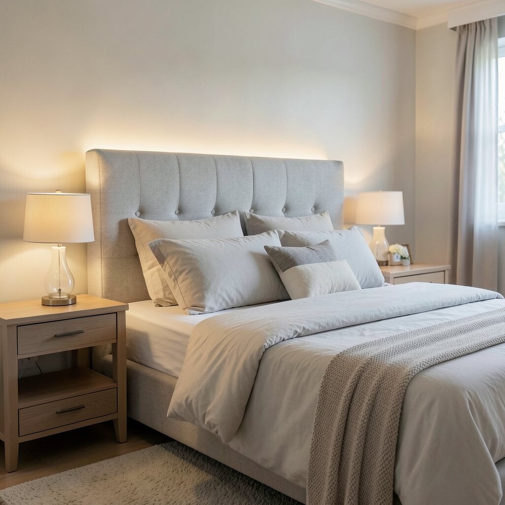 This is a great way to enhance a simple headboard. The lights create a soft halo effect, perfect for bedtime relaxation.