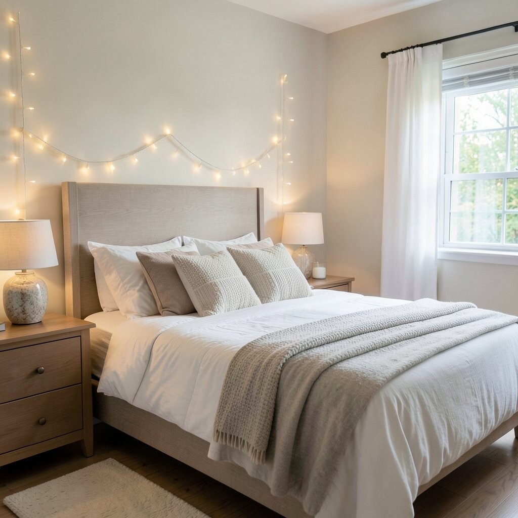 Hang twinkle lights in artful patterns above your headboard for a captivating effect. It draws attention to the bed and adds style.