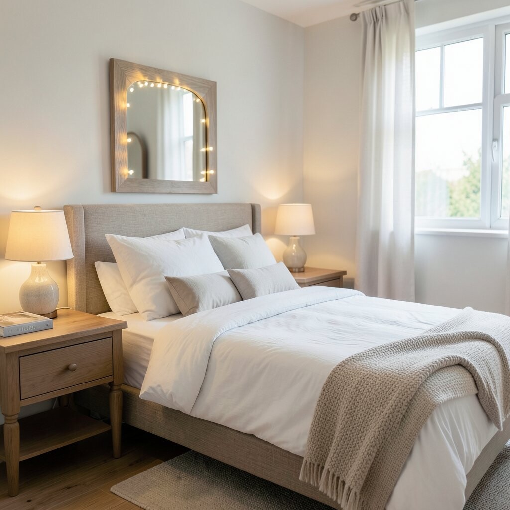 Wrap twinkle lights around your bedroom mirror to give it a soft, glowing frame. This not only lights up the mirror but also adds depth to the room.