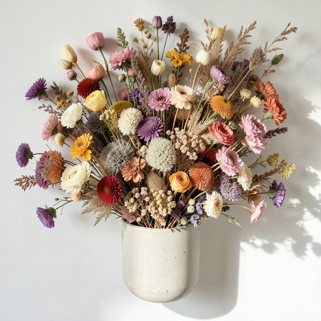 A wall planter filled with dried flowers is a great way to add greenery without the upkeep. It’s like having a garden that never needs watering.