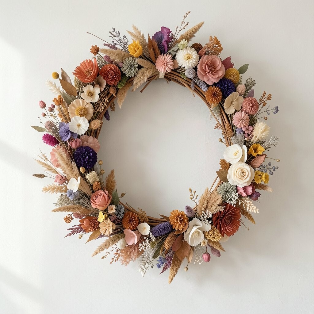 Why not start with a rustic dried flower wreath? It can evoke the charm of a countryside cottage right in your living room.