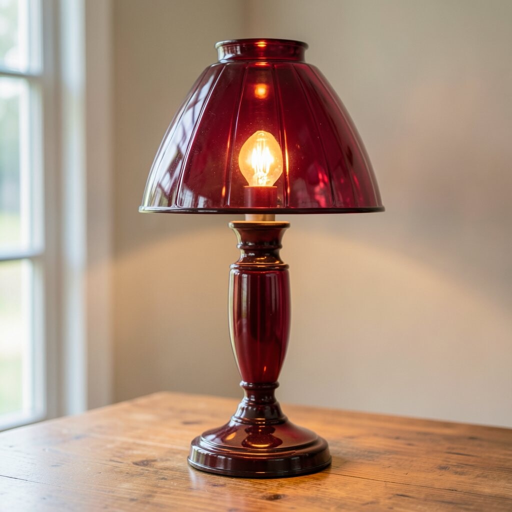 This lamp is as vibrant as a ruby. Its red glass base is bold and eye-catching.
