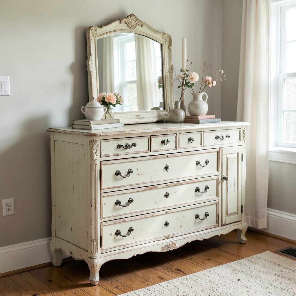 A shabby chic dresser brings a sense of charm and elegance to your space. Its distressed finish and delicate details make it a beautiful addition to any room.