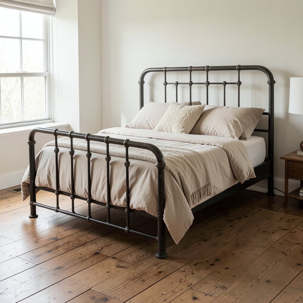 An industrial style metal bed frame adds a rugged yet chic look to your bedroom. Its sturdy design ensures it will last for years.
