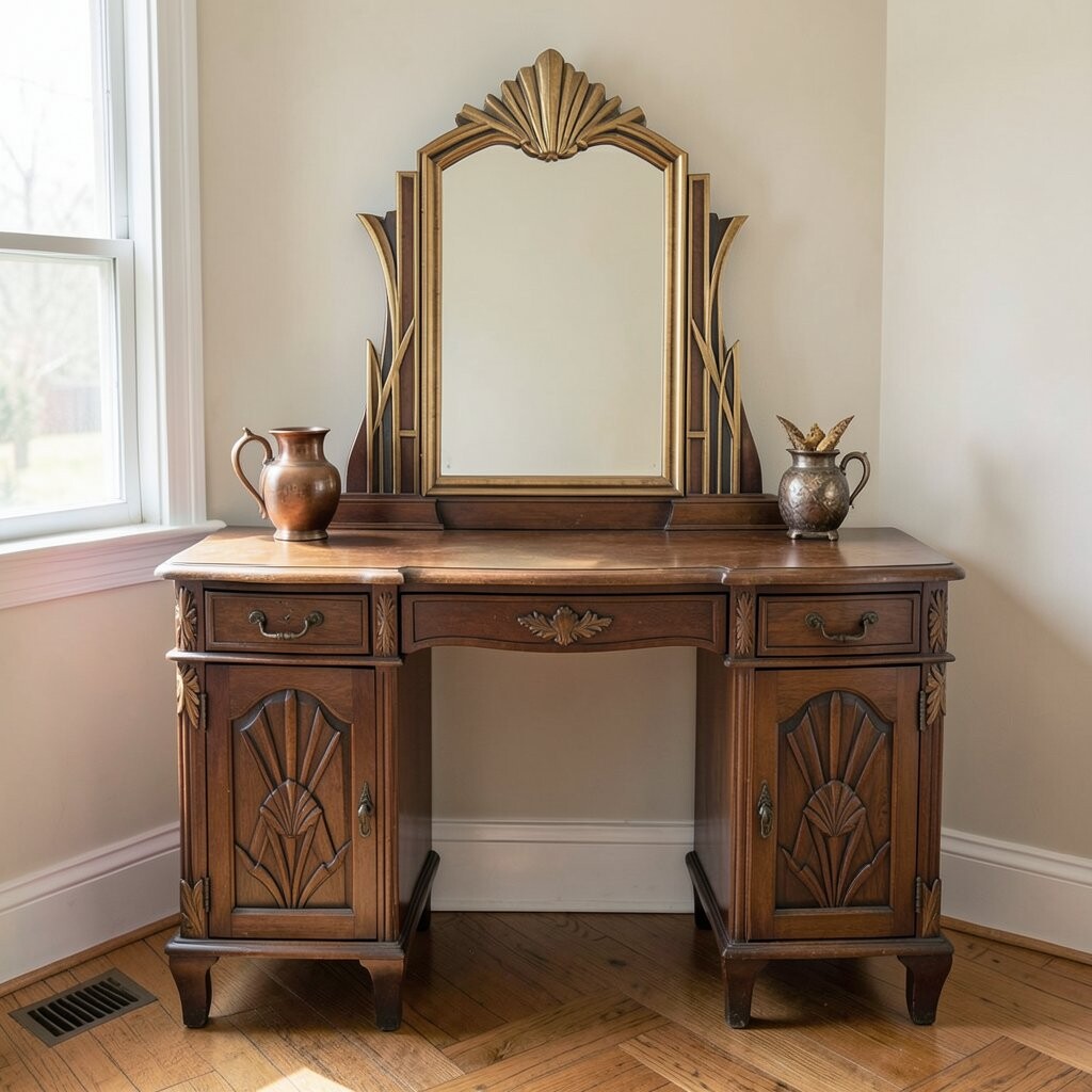 An Art Deco vanity is a glamorous addition to any bedroom. Its sleek lines and mirrored surfaces create a luxurious feel.