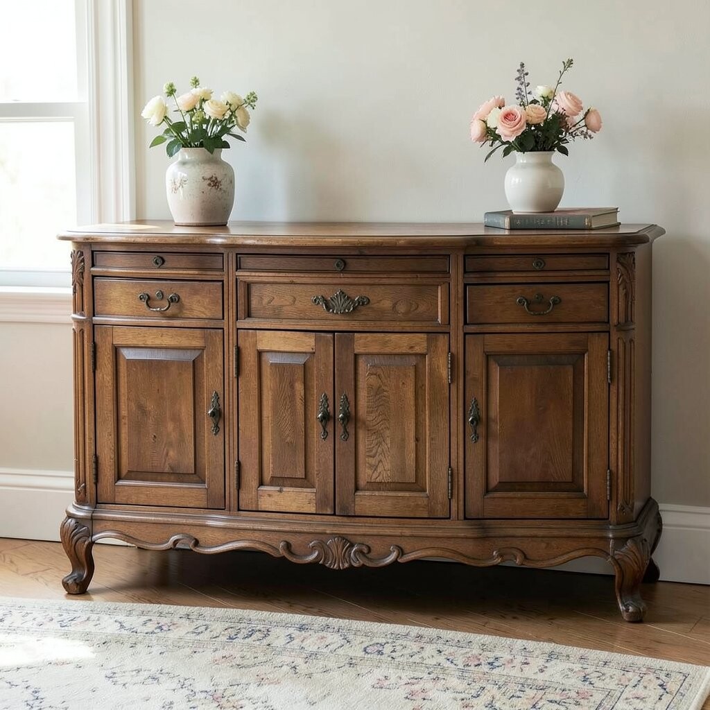 Consider adding a vintage mirror or artwork above the sideboard. It enhances the elegance and creates a stunning focal point.