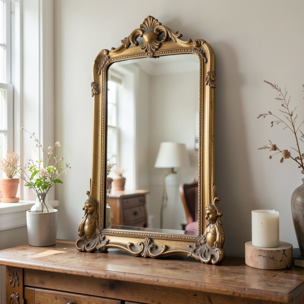 A vintage gilt mirror adds a touch of glamour and elegance to any room. Its ornate frame and reflective surface make it a stunning focal point.