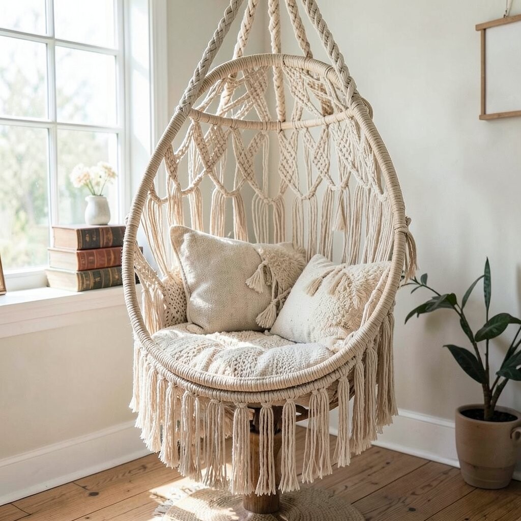 A bohemian macramé hanging chair is perfect for adding a touch of whimsy to your space. Its unique design creates a cozy spot for relaxation.