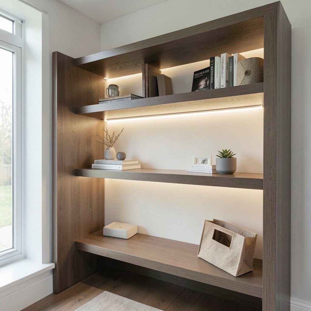 Make your shelf displays stand out with LED strip lighting. It gives your decor pieces the spotlight they deserve.