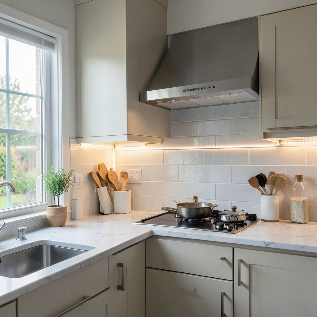 Illuminate your kitchen backsplash with LED strips for a modern touch. It highlights your kitchen’s best features.