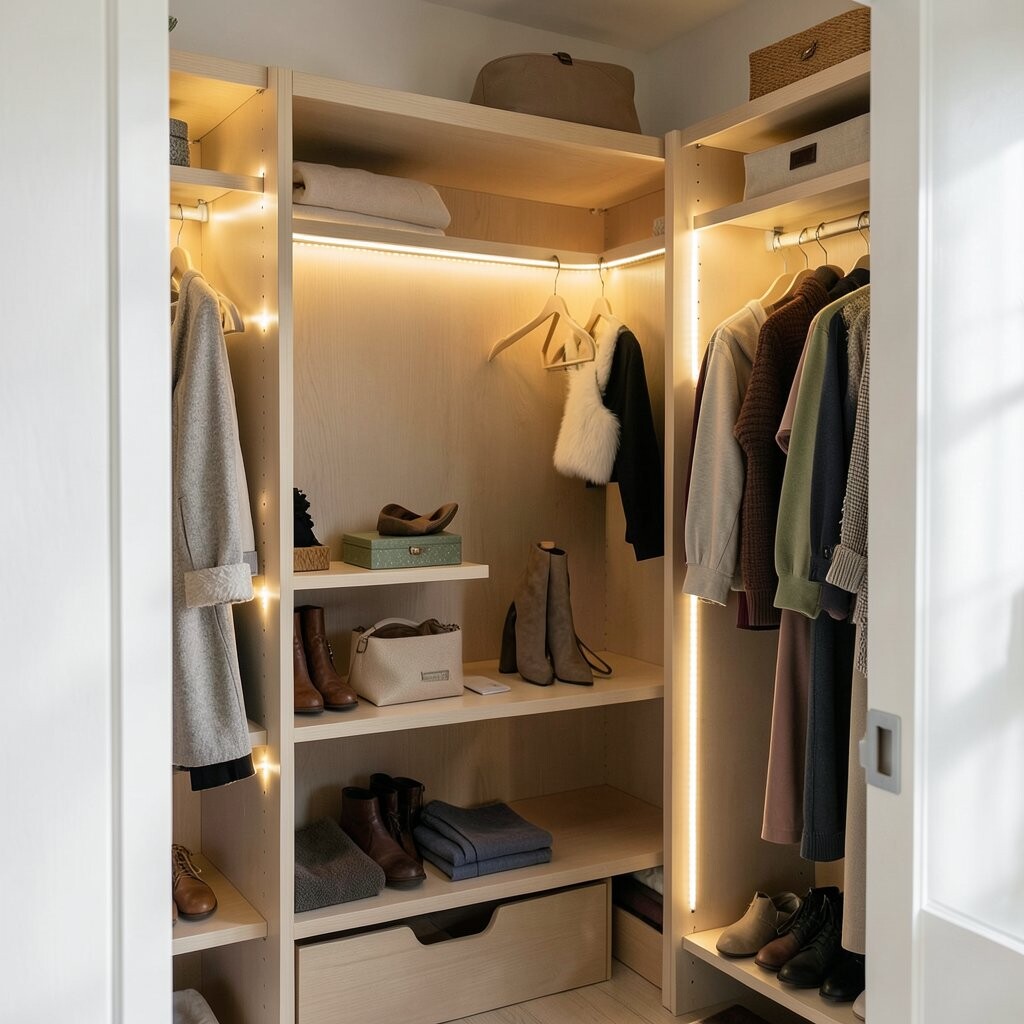 Light up your closet with LED strips to easily find your outfits. It makes getting ready a breeze.