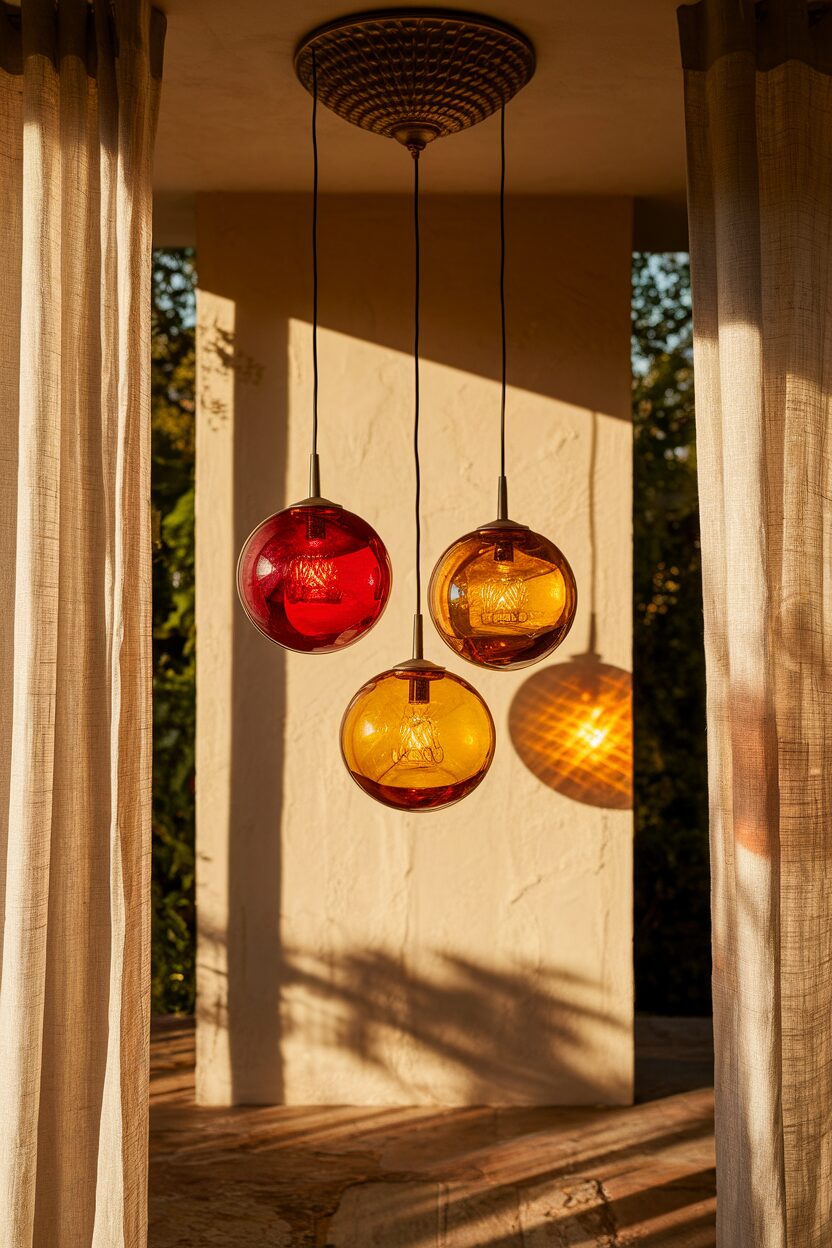 Colorful glass globe pendants can make a room pop. They bring a playful and vibrant energy to spaces.