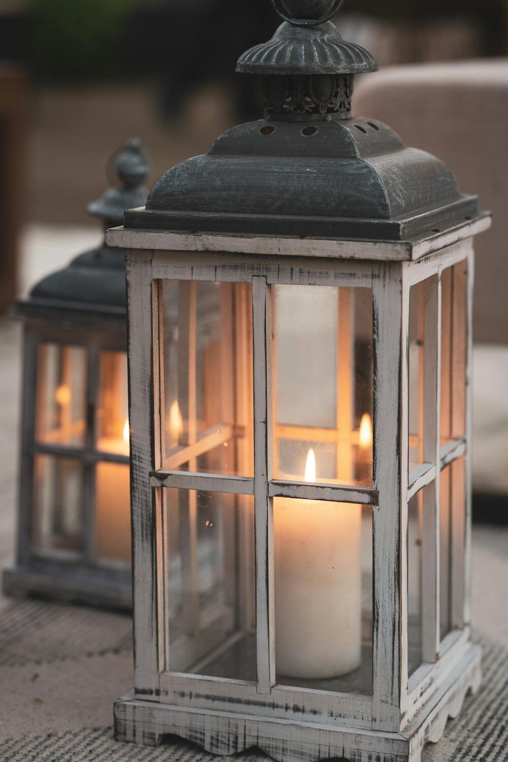 White washed lanterns bring a light, airy feel to farmhouse decor. Their soft color and distressed finish add a touch of rustic charm.
