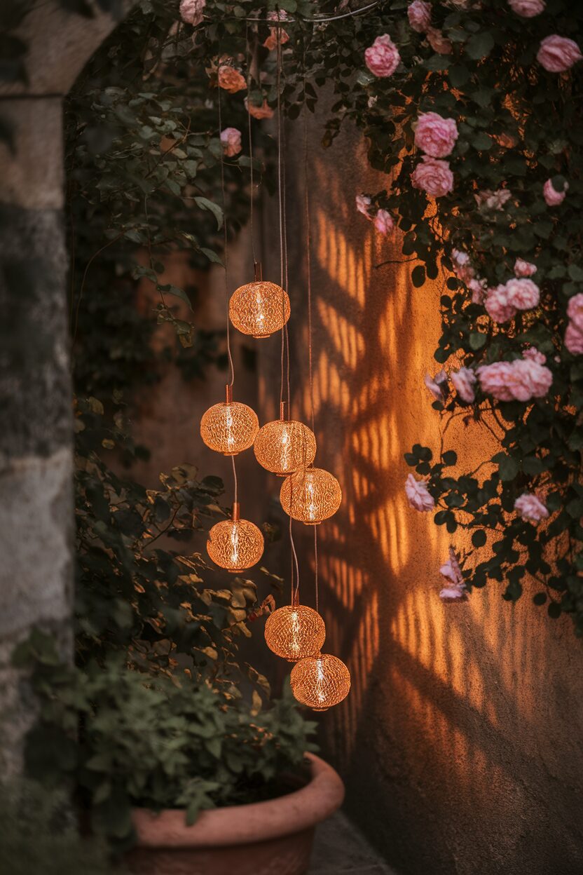 Hanging lanterns create height and interest. They’re ideal for small spaces where floor space is limited.