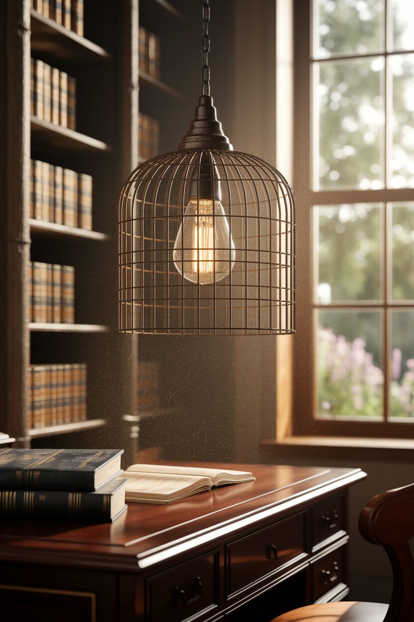 Great for living rooms or offices, it provides focused light for reading or working. The open cage design keeps it modern.