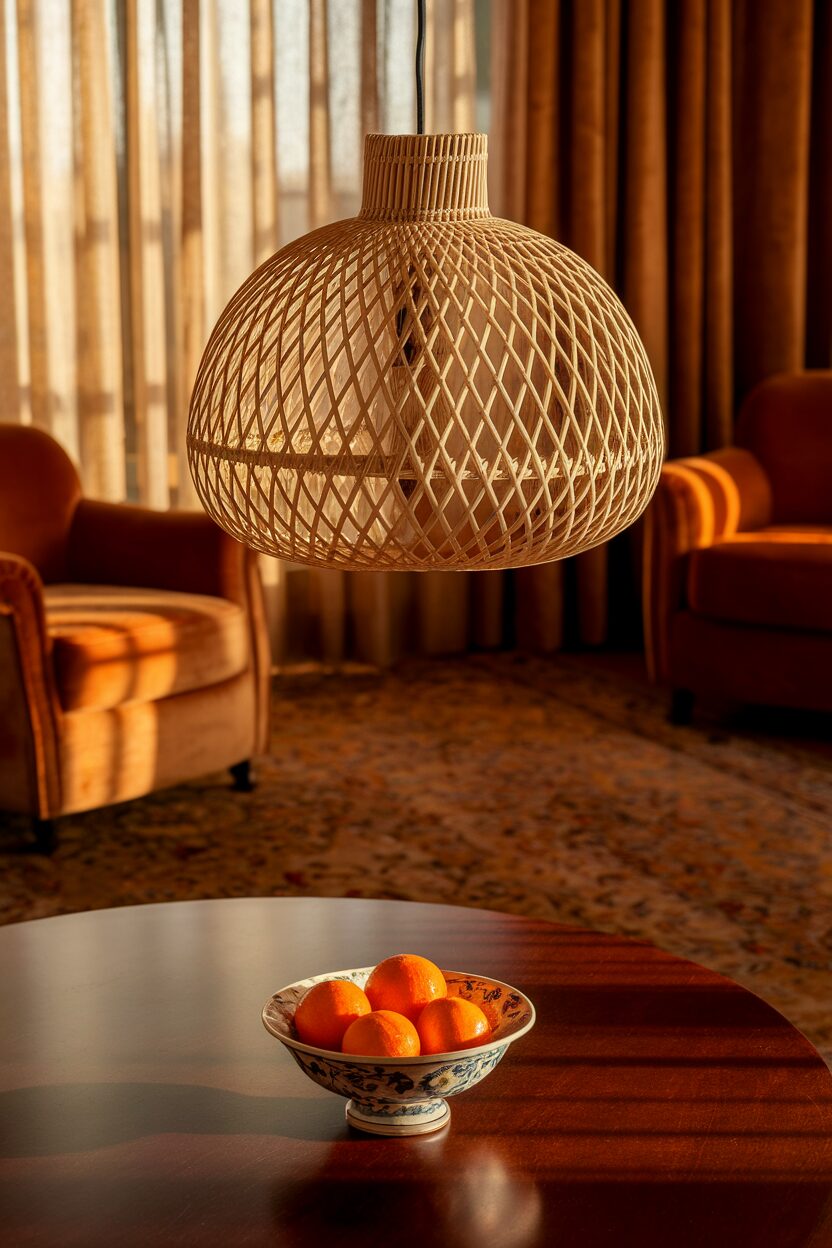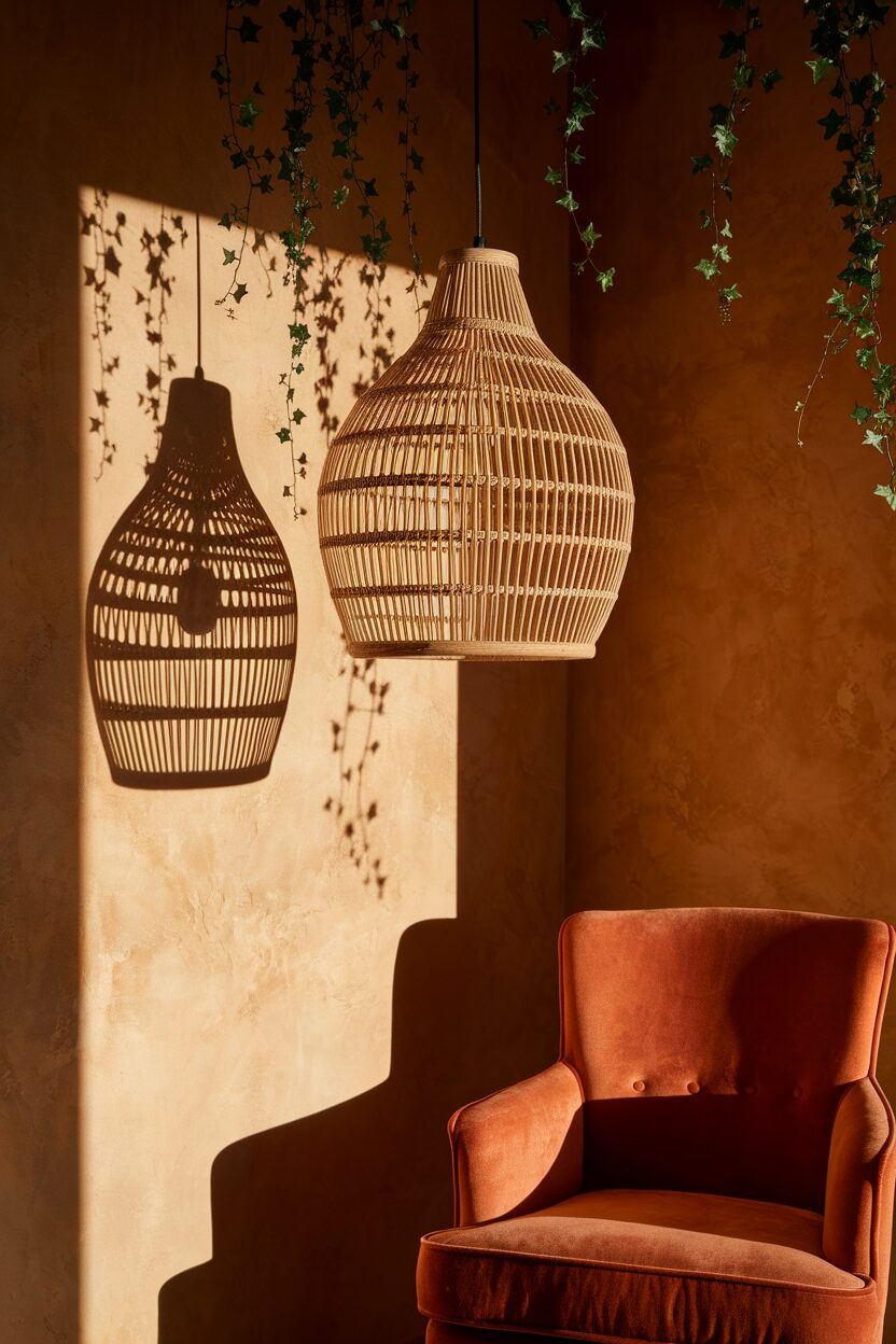 Imagine a snug reading corner bathed in soft light from a rattan lamp. This lamp creates a cozy nook perfect for curling up with a book.
