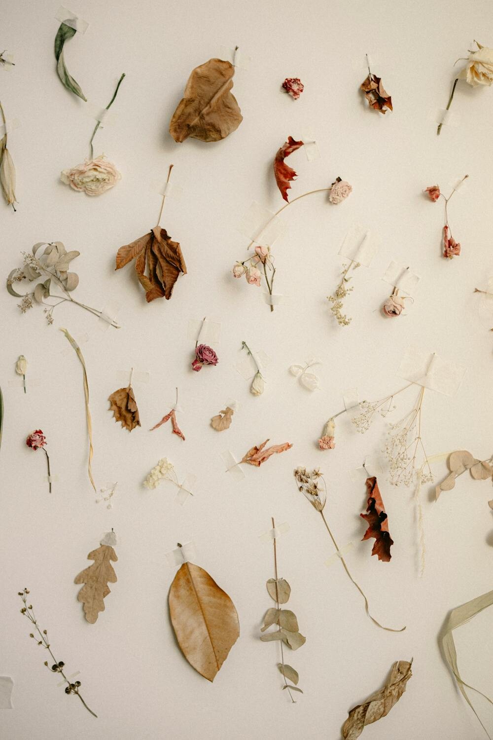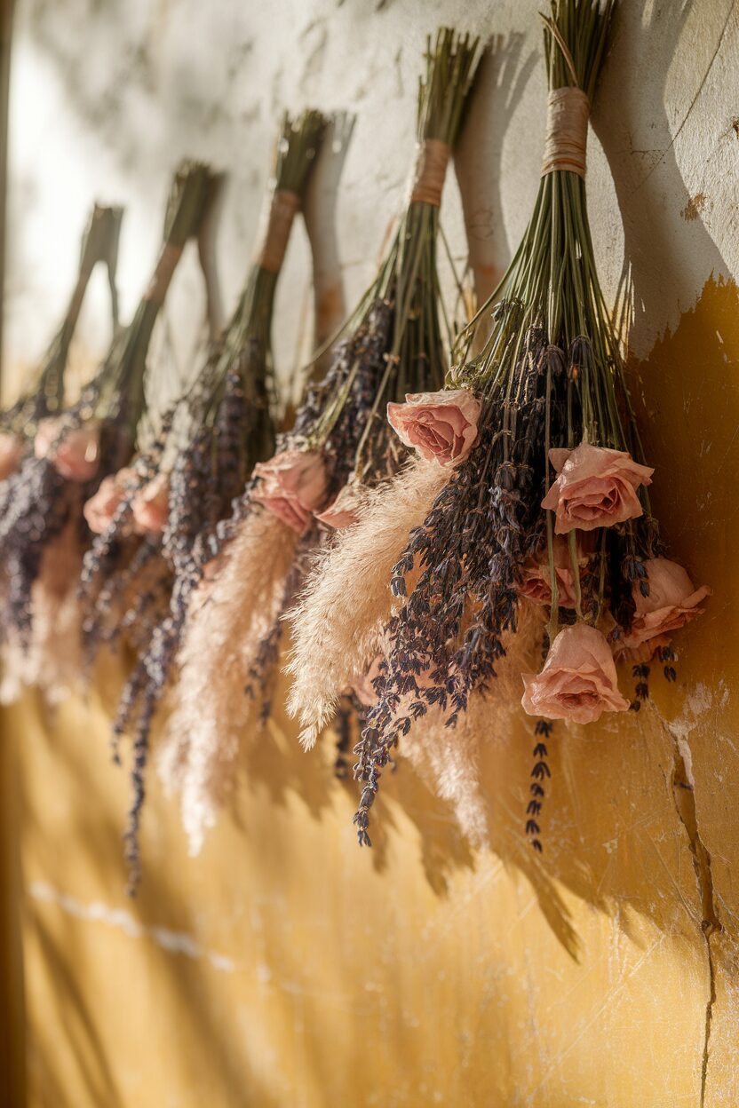 Hang small bouquets of dried flowers directly on the wall. Use hooks or pegs to create an effortless arrangement.