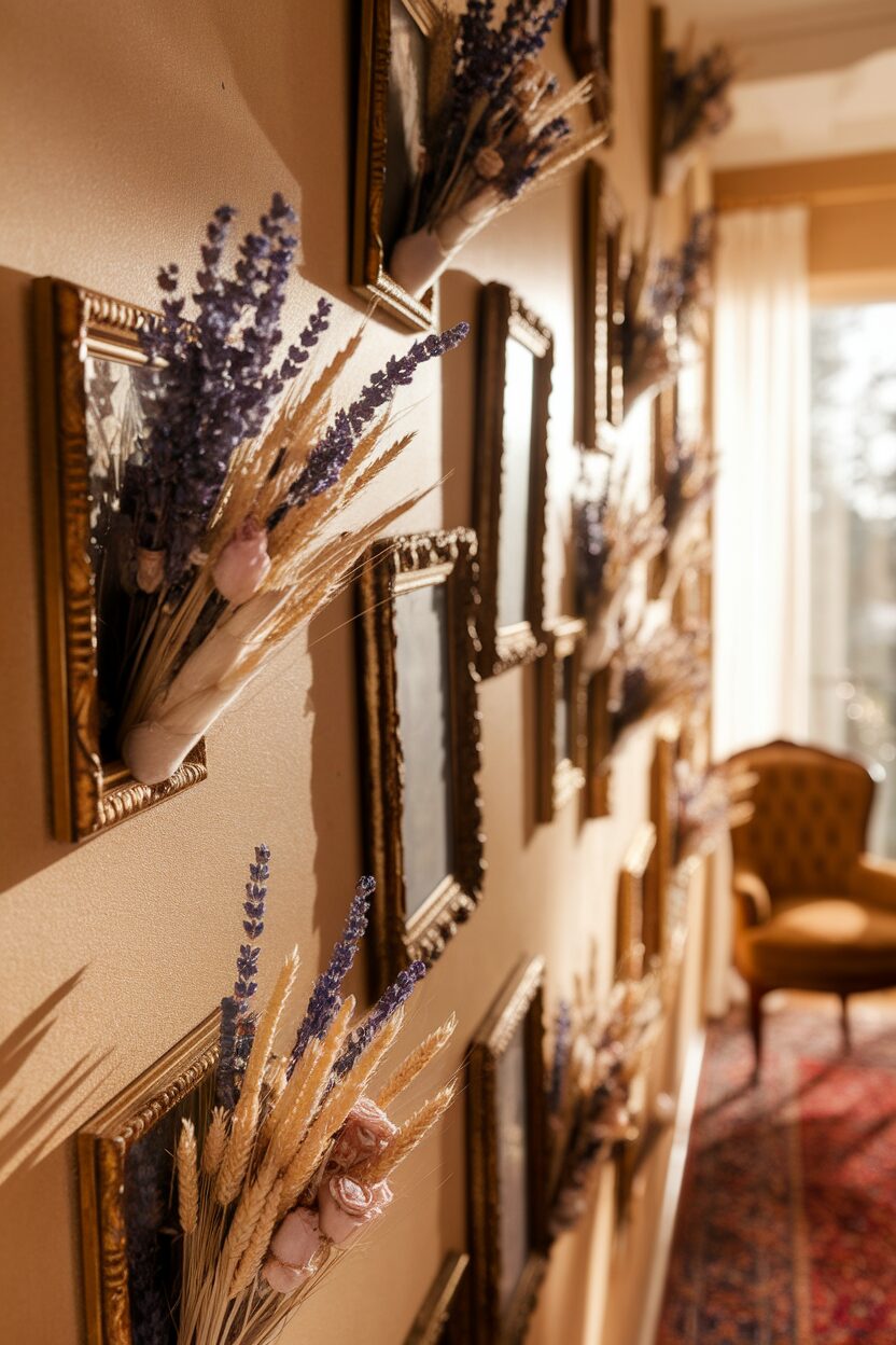 Turn your wall into a gallery with dried flowers framed like artwork. Each frame can hold a different type of flower, creating a diverse display.