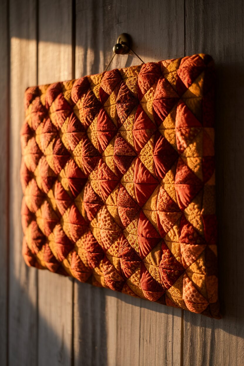 The uniqueness of quilted art lies in its blend of colors and textures. It’s a cozy, artistic addition to any room.