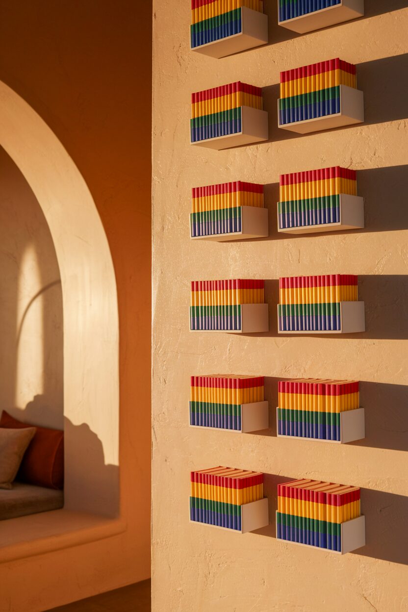 Do you love books and colors? Arrange your books by color on a floating ledge, creating a rainbow effect that’s both eye-catching and fun.