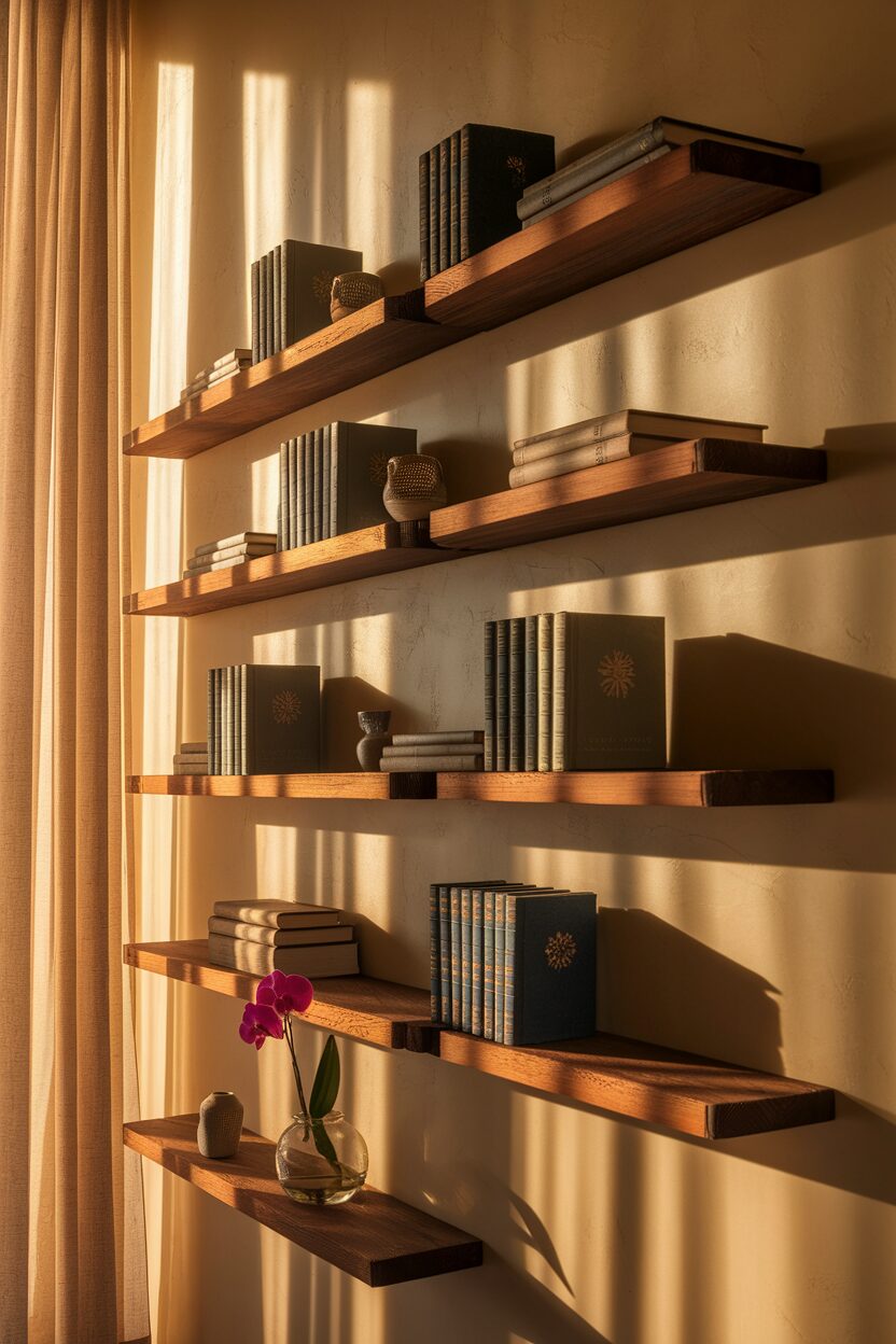 Picture your wall as a floating art gallery where shelves hold frames and sculptures. This idea embraces the charm of creating a mini gallery right in your living space.