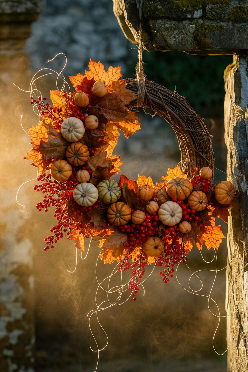 Using elements like mini pumpkins, pinecones, and colorful leaves, this wreath is a celebration of the harvest season. It adds warmth and coziness to any space.